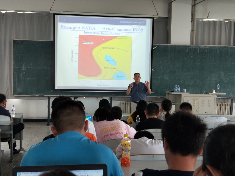 报告会中,学院副院长王纯杰先向同学们介绍了方宏彬副教授的个人简历,然后,方宏彬老师简单介绍本人的工作经验,简单介绍了关于肺癌和乳腺癌的一些案例和病例。主题是如何找到新药针对病情。讲述如何去治疗癌症,两种新药针对一种疾病的效果是加和作用还是促进作用,进而了解新药的效果,运用了一些关于数学统计的公式推倒去验证结论;讲述了应该怎么样去做实验去验证结论,清楚的讲述了统计的应用以及大部分人对统计理解的偏差。老师和学生提出提出了一些问题,方洪斌老师都作出了一一解答并且解答的非常详细,使得学生和老师得到了知识的提升,加大了对此方向更深刻的了解。