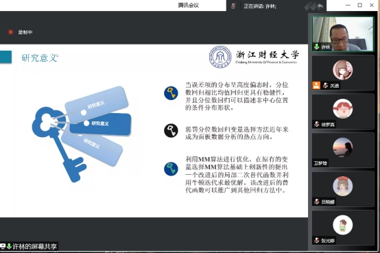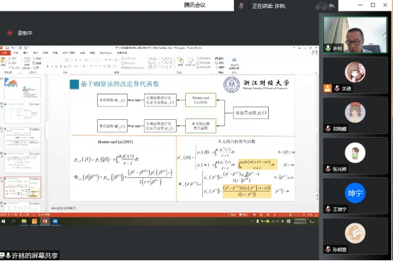 报告过程中,许林老师利用MM算法提出具有即时适应性的动态阈值替代函数进行若变量筛选,并给出针对于面板数据随机效应模型的 Two-step 估计过程,并且利用渐进理论证明了新替代函数的算法与原替代函数的算法具有相同的收敛性;与此同时,老师还比较并讨论了两种替代函数的性能。数值模拟结果和实例数据分析过程表明,当迭代估计的初始值较大时,本文所提出的替代函数的具有更好的统计推断效果。