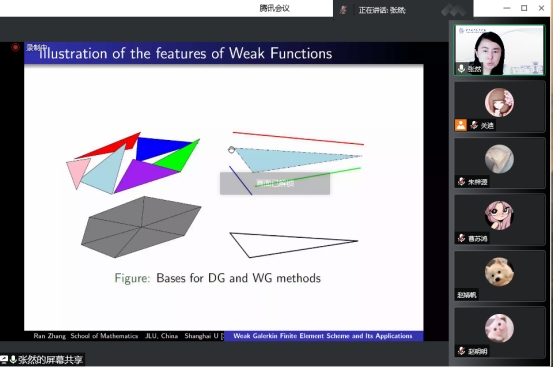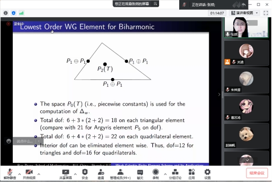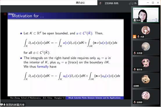 报告会伊始,张然教授向我们分享了吉林大学数学学院近十年来在计算数学方向发展过程中的经验教训和成果。而后具体讲解了在弱有限元方法上的重大成果,解释了弱算子、稳定子的概念,并用几个例子具体讲解了弱有限元方法的特点。在此基础上,张然教授对正则性的函数像延伸到边界该如何解决,提出了在