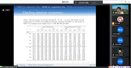 在报告中,钟威教授从Independent Data,Longitudinal Data以及Common Structure for Panel Data这三种类型的数据出发,详细分析多折点分位数回归问题。并且以肱三头肌皮脂厚度和女性孕酮数据为例对MKQR模型以及应用问题进行了介绍。此模型的应用不仅允许有多个折点,还可以根据数据选择折点。在非参数估计中介绍了两种解决方法:一种是核估计方法,另一种则为样条方法。讲解方式深入浅出,不仅让师生充分了解了MKQR模型,也激发了同学们对此研究方向浓厚的学习兴趣。
