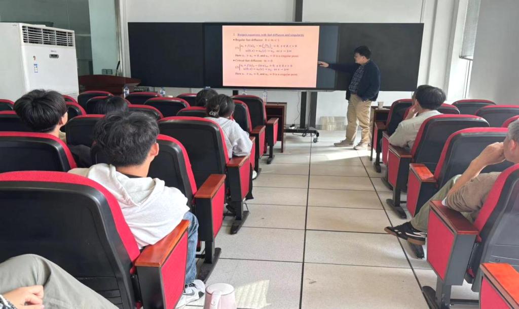 在报告中,梅茗教授首先向同学们介绍了一种重要的非线性偏微分方程,即Burgers方程,它在物理学、流体力学以及数学等多个领域中均有着广泛的应用。随后,梅茗教授详细地讲解了带有快扩散和奇性的Burgers方程粘性激波的稳定性。在常数状态u+=0时,该方程由于多孔介质中的快速扩散特性,展现出了强烈的奇性。针对这一难题,梅茗教授技巧性地选取了与粘性激波相关的加权函数,利用加权能量技术有效地克服了Burgers方程的奇性。最后,梅茗教授解释了这一方法的原理和应用过程,让在场师生深受启发。
