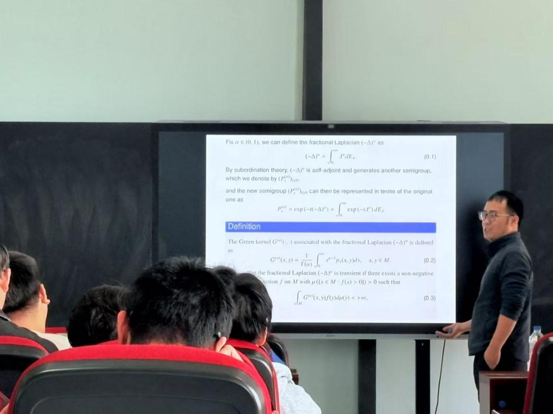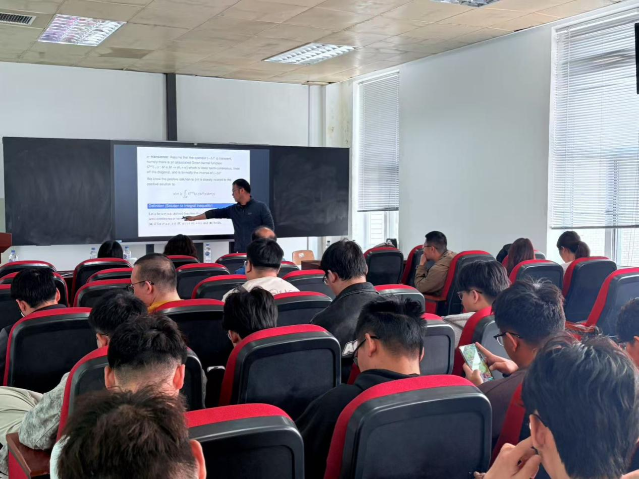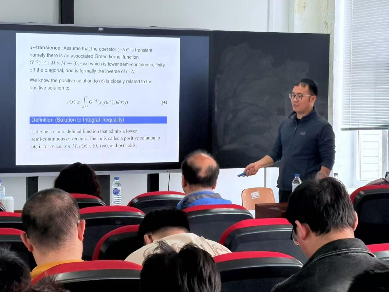 此次报告,孙玉华教授围绕 “流形上非局部椭圆不等式正解的存在性与不存在性” 展开深入探讨。从研究背景与预备知识说起,在非紧测地完备流形的大前提下,孙教授聚焦不等式正解的情况,详细介绍了流形的体积加倍条件和庞加莱不等式。对于分数阶拉普拉斯算子,他从积分算子、傅里叶方法等多种视角给出定义,并讲解了格林核的定义、性质以及分数阶拉普拉斯算子暂态性的定义,这些基础知识为后续深入研究搭建了稳固的基石。
