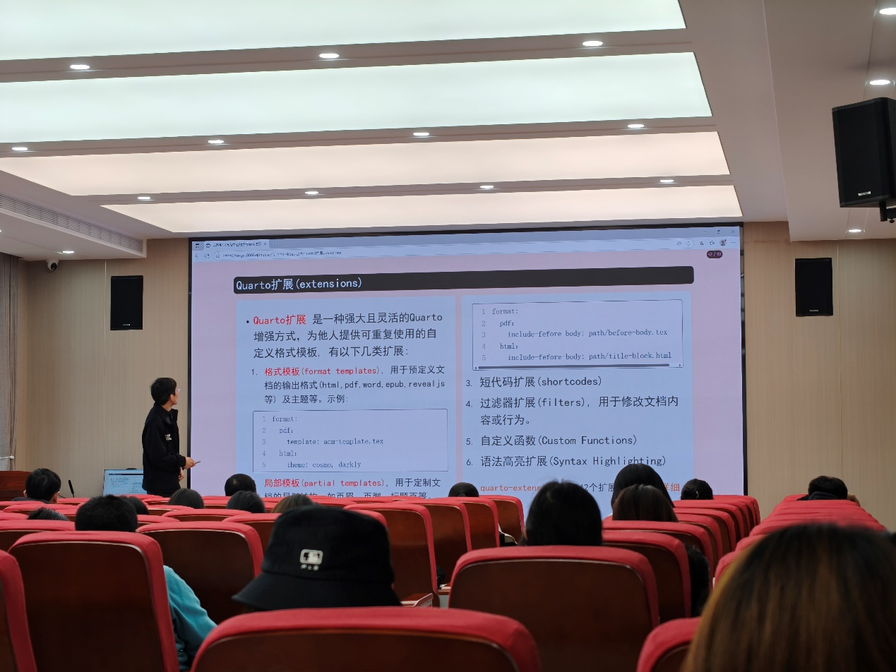 报告结束后,现场师生与汤教授围绕 Quarto 扩展的实际应用场景、技术细节等方面展开了热烈讨论。大家各抒己见,教授耐心解答疑惑,在思维的碰撞中,师生们对 Quarto 扩展的理解进一步加深,也激发了更多关于文档创作与技术创新的思考,为后续的学术研究和实践应用注入了新的活力。