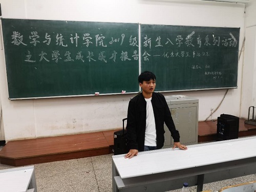 报告会上,卢继迎结合自己大学三年学习生活向大家分享了入学、大学生活和学习规划三个不同方面的经历和经验。她表示大学生活与高中相比更自由,同时也更容易迷茫,希望同学们能够养成良好的生活和学习习惯,做好大学生活规划。此外她强调,大学除了学习也要多参加活动,丰富自己的大学生活,充实自己的经历。马壮通过幻灯片向同学们展示了自己大学三年和学院同学所获得的证书。马壮向大家介绍了“数学建模”、“SAS数据分析”、“大学生创新创业大赛”等竞赛,希望以此激励新生不断进取,在更高的平台上展现自我。还特别强调同学们要在政治思想上有所提高,追逐党的步伐,做一名合格的社会主义接班人。