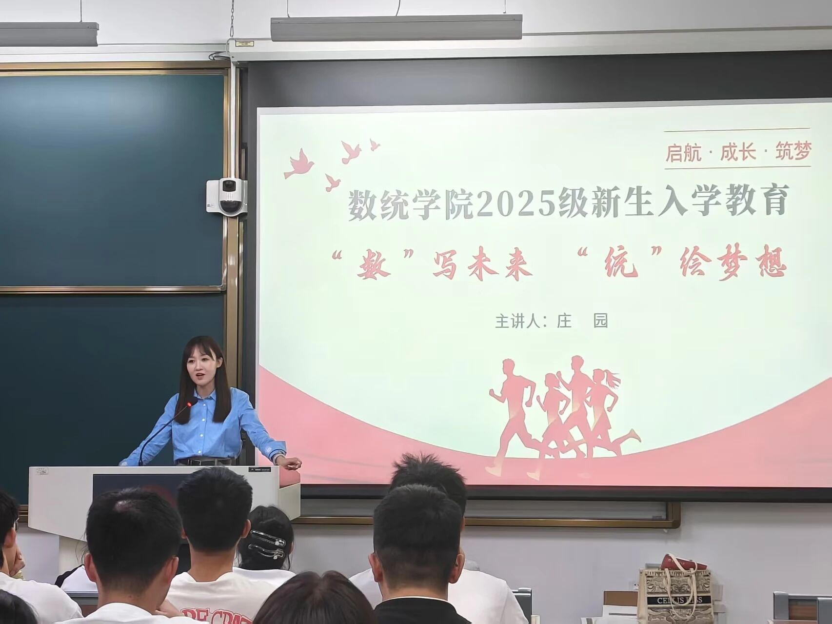 于9月8日晚在主楼232和240教室开展以“‘数’写未来,‘统’绘梦想”为主题的新生入学教育课。本次课程由学院团委书记、2025级本科辅导员庄园老师主讲,2025级全体新生参加。