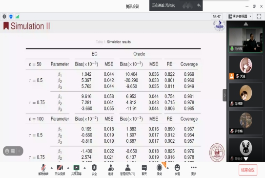 报告会中,冯兴东教授从分位数回归在经济学、金融学等学科领域中拥有着广泛的应用开始介绍,共同探讨哪些变量比较有用又是高维统计学中长期研究的热点问题。通过报告全局性地介绍了统计学中常见的分位数回归模型与该模型框架下的不同变量选择方法,以及适应大数据场景的分布式计算的相关内容。使大家对分位数中变量选择产生了浓厚兴趣。