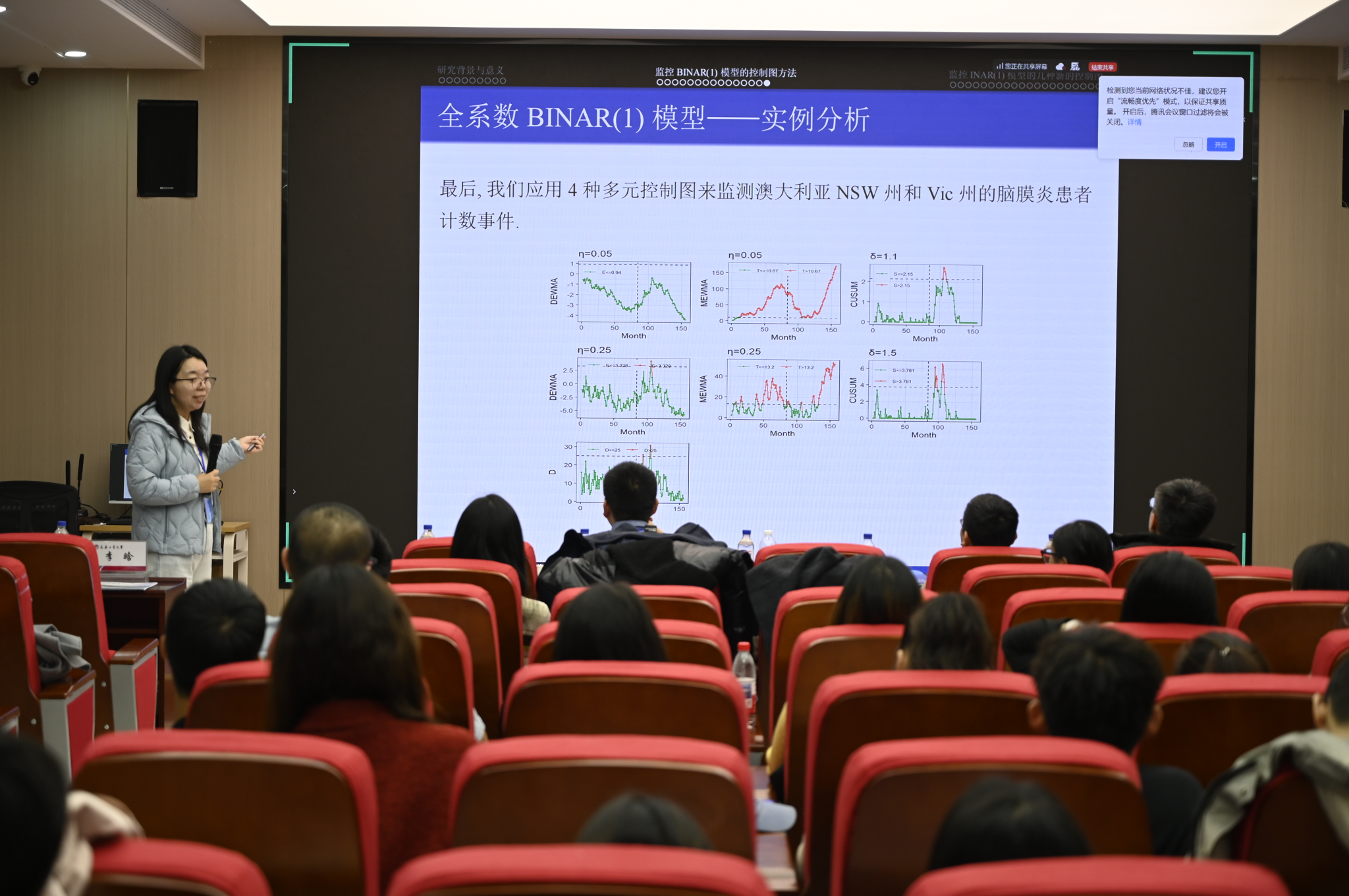 吉林大学李聪副教授则作专题报告题为《监控两类重要的时间序列模型的控制图方法及其应用》。李聪老师从制造业、自动化系统中广泛存在的计数序列出发,指出传统假设“独立同分布”在实际中常被破坏,因而提出基于整数值时间序列(Integer-valued Time Series)建模的新控制图方法,对两类关键自回归模型进行了深入探讨,并通过大量数值模拟分析其平均运行长度(ARL)与稳健性,展示了其在生产线不合格产品数量、设备故障频次等实际情境中的应用价值。