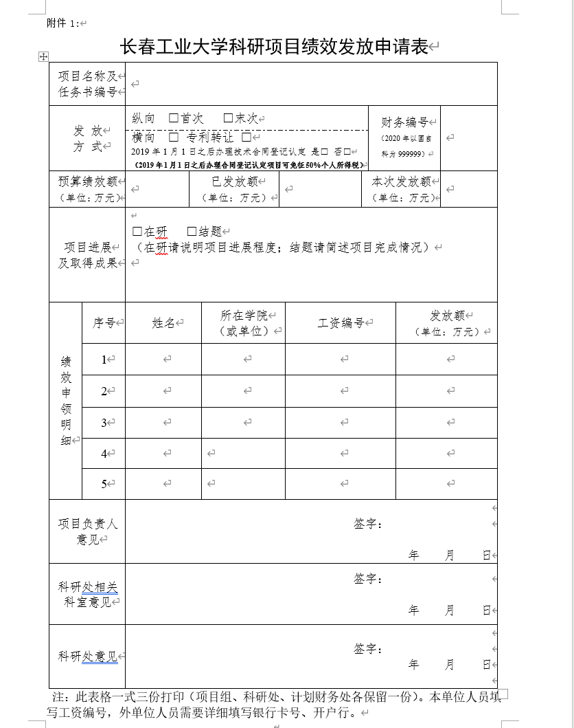 1、每年6月1日和11月1日,项目负责人携带“绩效发放申请表①(一式三份纸质版需签字、word电子版发送至邮箱[email protected])”、合同书复印件②、经费预算表③、企业验收证明④、技术合同登记证明复印件⑤,到科研处相关科室办理登记。