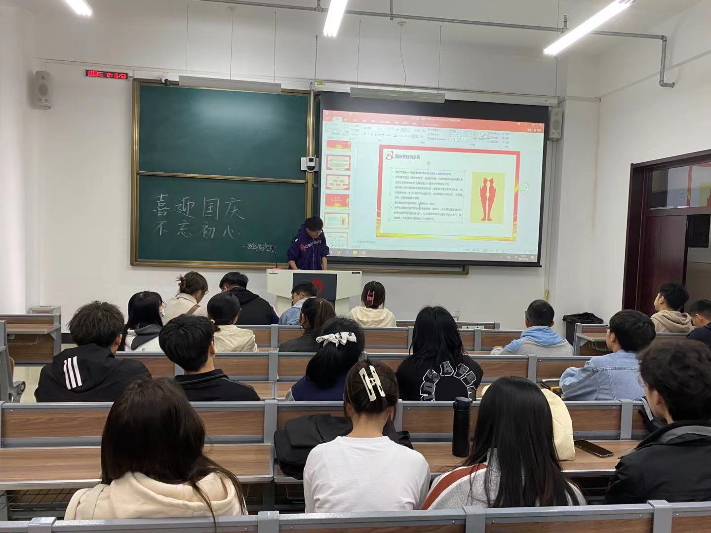会议开始,颜兴洲为大家介绍国庆节的历史及伟大的祖国在过去72年里的发展历程,组织大家观看新中国建设和发展的影片;在会议上,颜兴洲与各班级团支部委员们共同学习了近代国人经过一百多年的英勇奋战,在中国共产党的领导下,取得了人民革命的伟大胜利,为中国人民谋幸福,为中华民族谋复兴。在1949年10月1日宣告中华人民共和国成立,这是中国历史上一个最伟大的转变,从中国人民站了起来,到现在中国人民强了起来,在庆祝新中国72年华诞之际,观影回顾了新中国的伟大历史、伟大征程、伟大成就,不断地强化同学们不忘初心,牢记使命,坚定信念,勇于担当,努力奋斗,学业报国的爱国情怀。